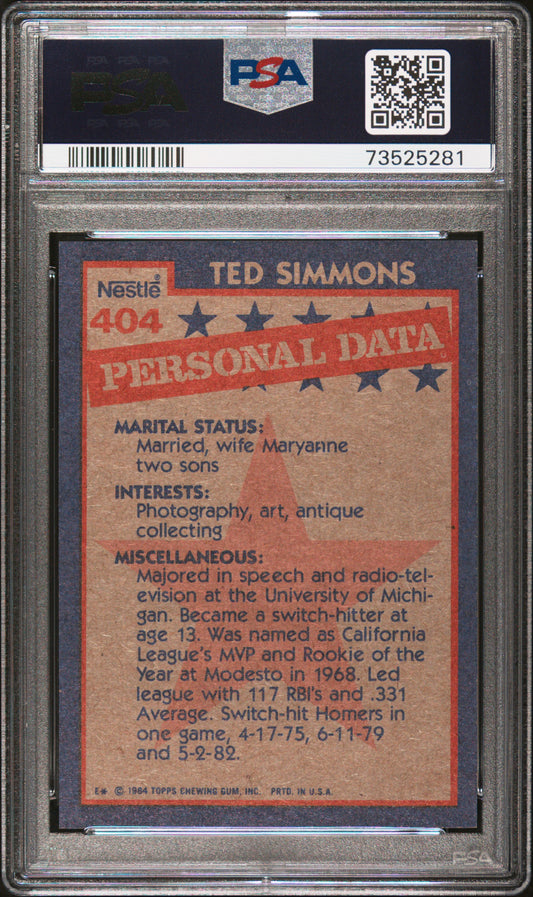 1984 Topps Nestle Hand Cut Baseball Ted Simmons #404 Psa 9 73525281