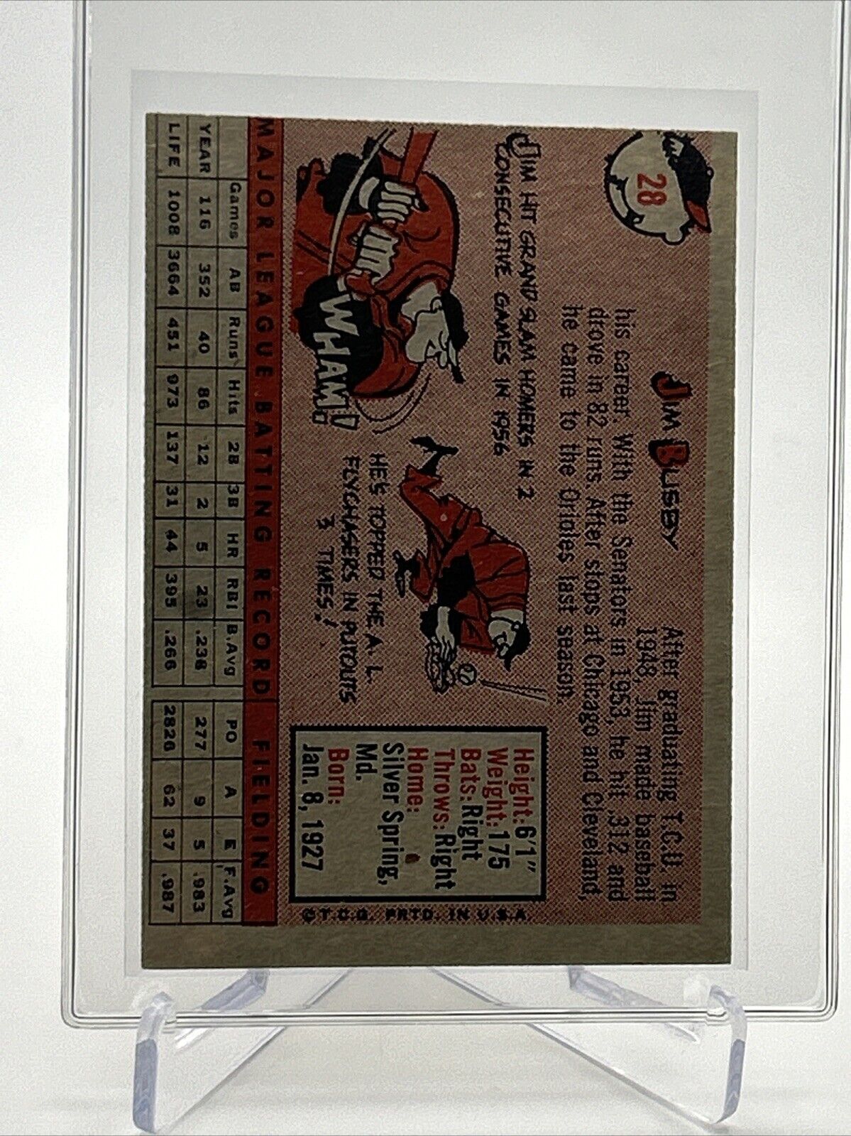 You are purchasing a 1958 Topps Jim Busby #28. You will receive the exact item in the scans. Free shipping with tracking is provided for this listing. We have over 125,000 positive feedback.We provide free 30 day returns on all purchases. Please reach out with any questions. Thanks for your consideration. Listed With Mascot.