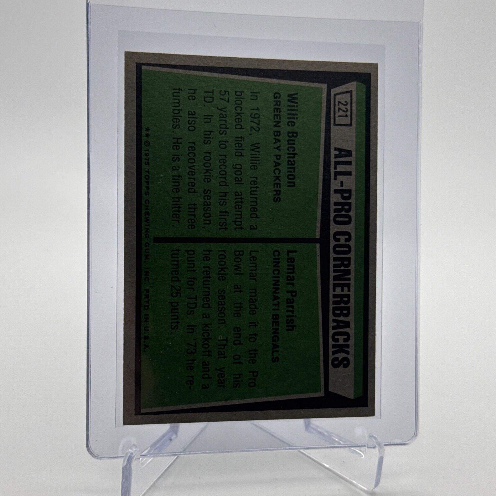 You are purchasing a 1975 Topps Lemar Parrish Willie Buchanon #221. You will receive the exact item in the scans. Free shipping with tracking is provided for this listing. We have over 125,000 positive feedback.We provide free 30 day returns on all purchases. Please reach out with any questions. Thanks for your consideration. Listed With Mascot.
