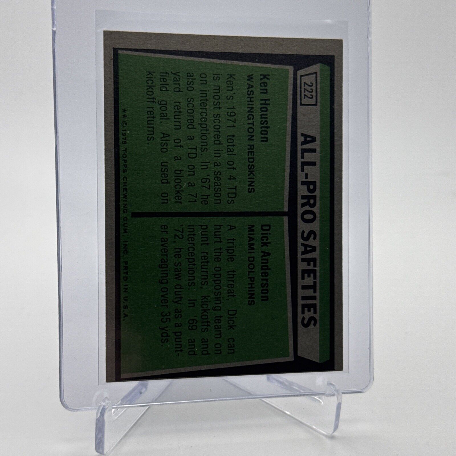 You are purchasing a 1975 Topps Ken Houston Dick Anderson #222. You will receive the exact item in the scans. Free shipping with tracking is provided for this listing. We have over 125,000 positive feedback.We provide free 30 day returns on all purchases. Please reach out with any questions. Thanks for your consideration. Listed With Mascot.