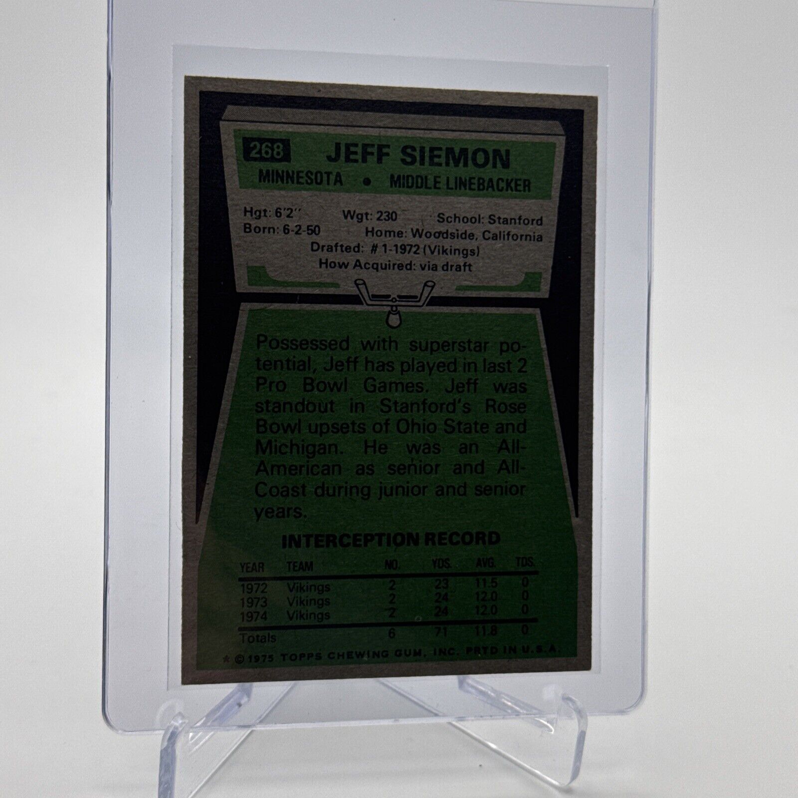 1975 Topps Jeff Siemon Football Card #268 NM Quality #3 FREE SHIPPING