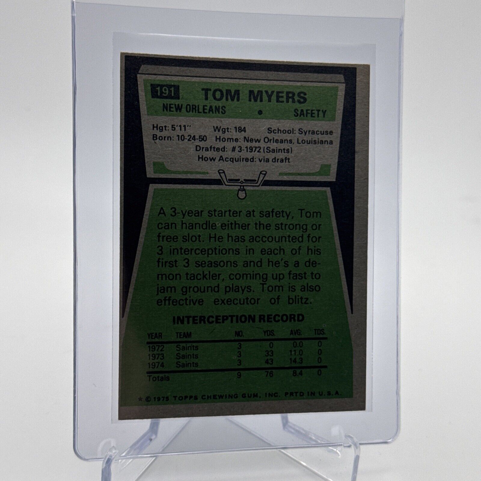 1975 Topps Tom Myers Football Card #191 NM Quality #3 FREE SHIPPING