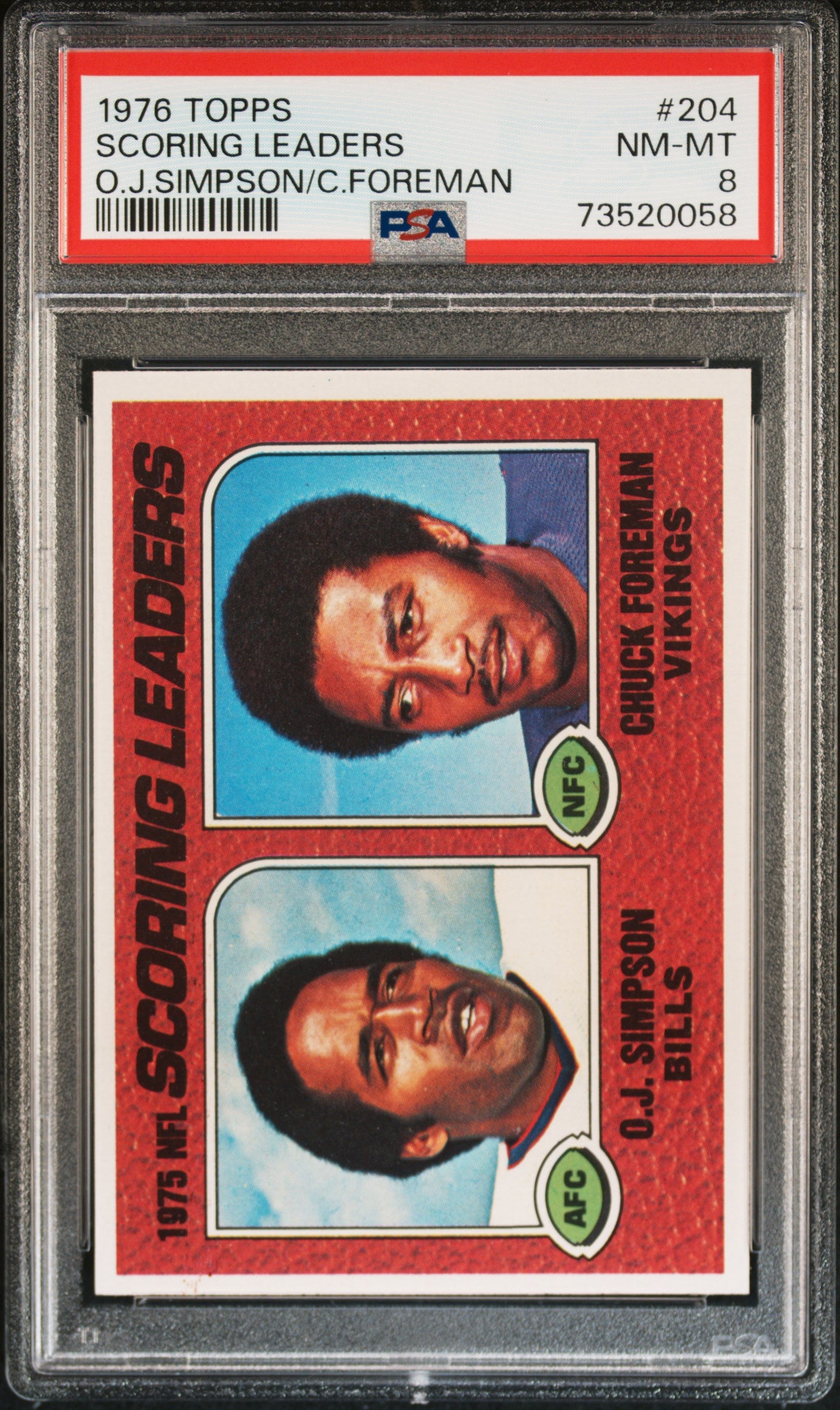 Hello, thanks for your interest in this fixed price listing. You are purchasing a 1976 Topps Football Scoring Leaders #204 PSA 8 73520058. This fixed price listing is for the exact card listed in the title, and shown in the pictures. We guarantee that you will be satisfied with your purchase, or you are welcome to return the card (at my cost) with our 30 day return policy. This listing is brought to you by Sports Cards Grading. Sports Cards Grading is a Top Rated Plus eBay seller. Top Rated Plus eBay sellers are required to provide 30 day free returns, shipping within 1 day, and shipping with tracking. Shipping with tracking in a bubble mailer is our standard method of shipment. Please contact me through eBay if you have any questions on this listing. Thanks for your consideration. Listed With Mascot.