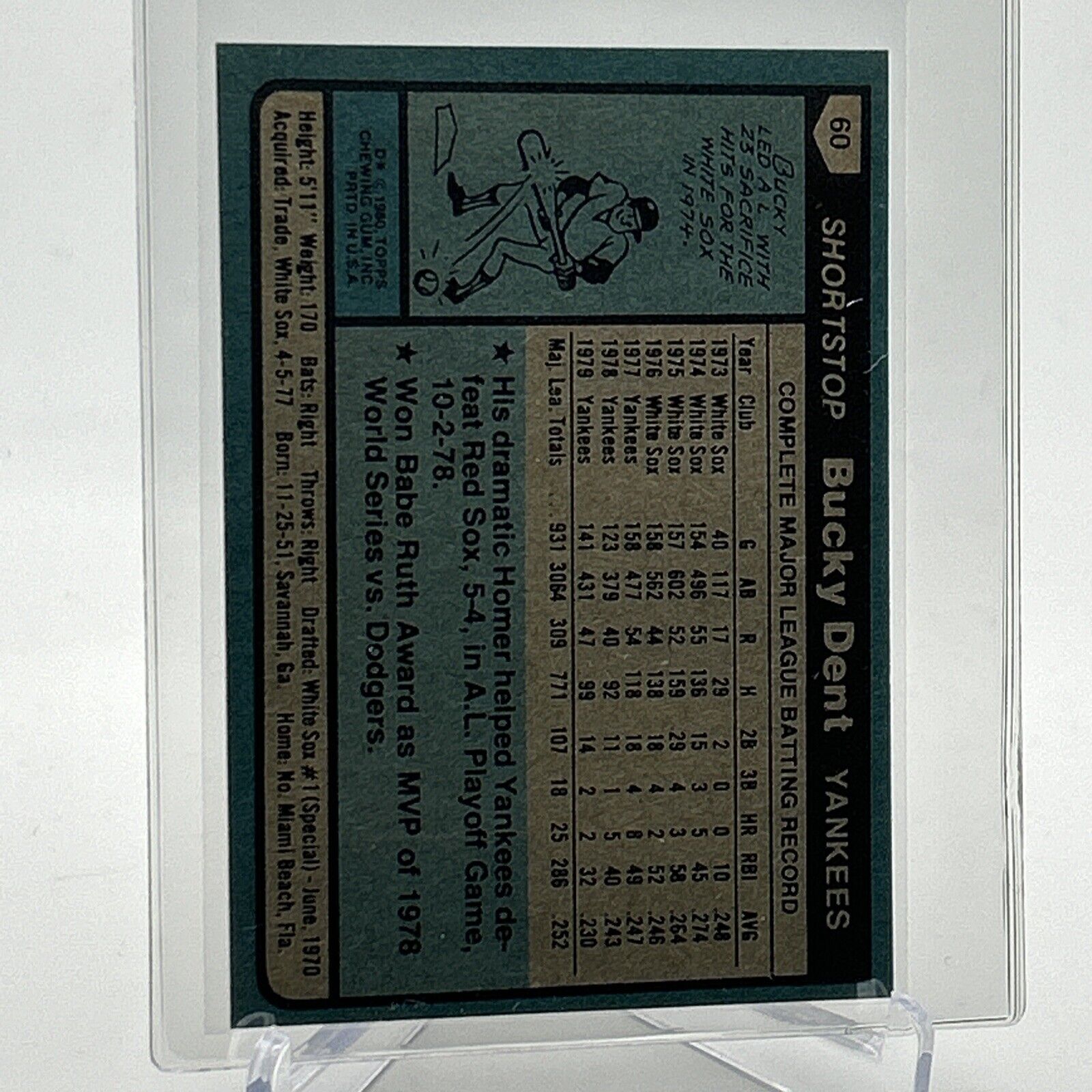 1980 Topps Bucky Dent Baseball Card #60 NM-Mint FREE SHIPPING