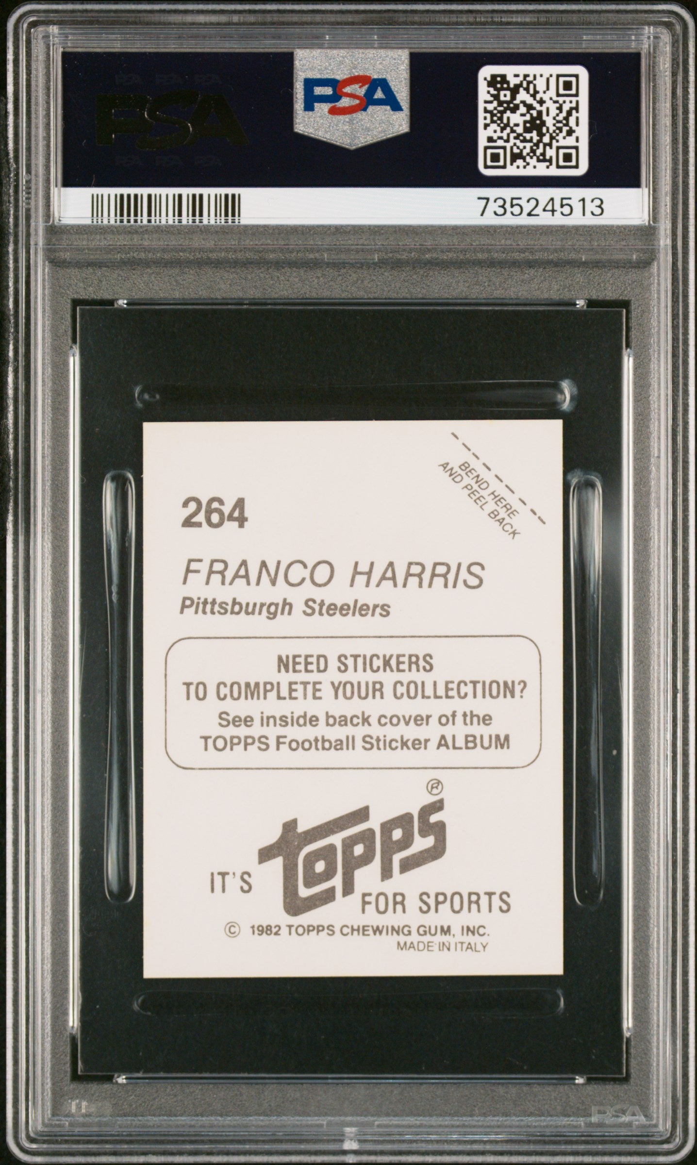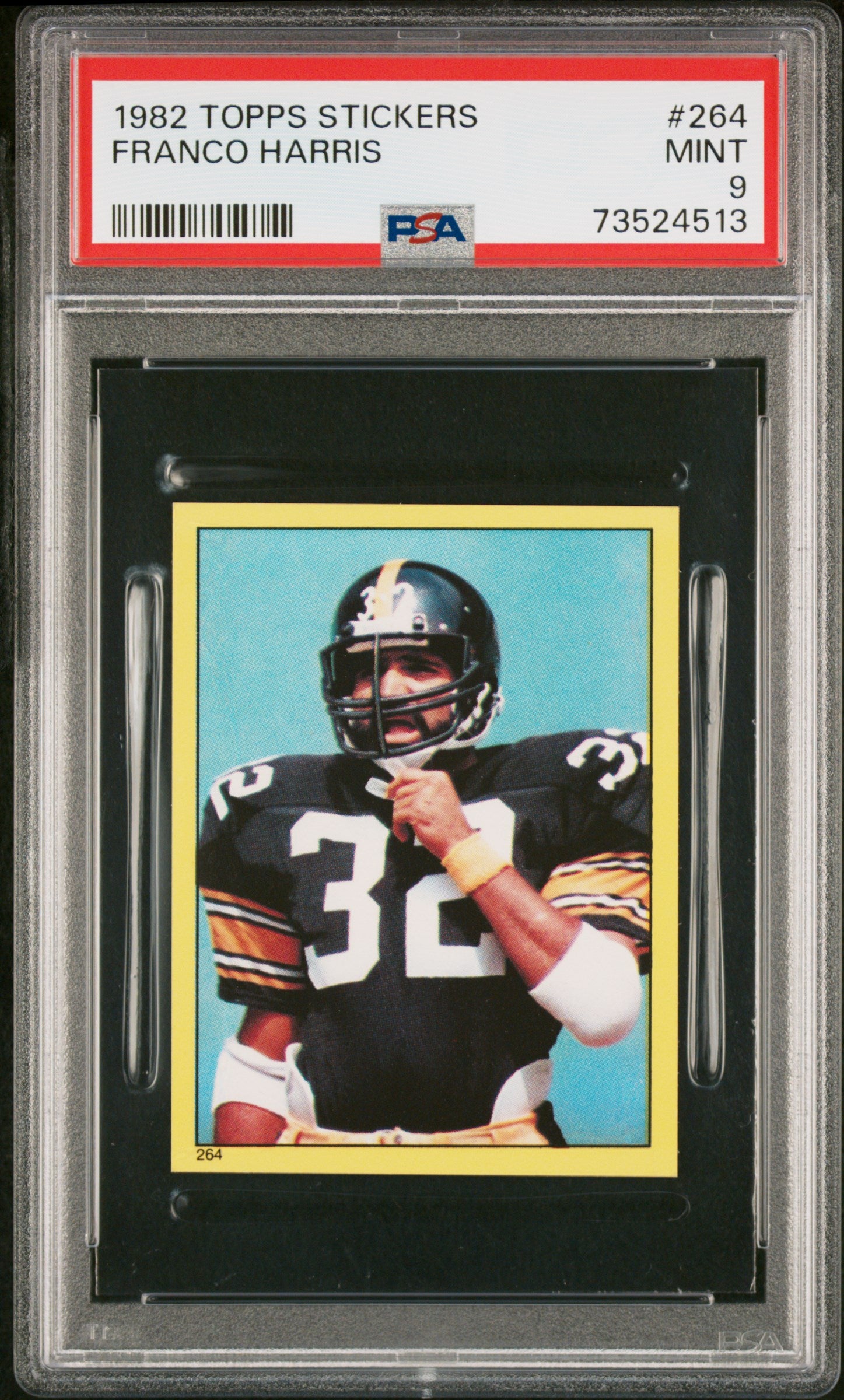 Hello, thanks for your interest in this fixed price listing. You are purchasing a 1982 Topps Stickers Football Franco Harris #264 PSA 9 73524513. This fixed price listing is for the exact card listed in the title, and shown in the pictures. We guarantee that you will be satisfied with your purchase, or you are welcome to return the card (at my cost) with our 30 day return policy. This listing is brought to you by Sports Cards Grading. Sports Cards Grading is a Top Rated Plus eBay seller. Top Rated Plus eBay sellers are required to provide 30 day free returns, shipping within 1 day, and shipping with tracking. Shipping with tracking in a bubble mailer is our standard method of shipment. Please contact me through eBay if you have any questions on this listing. Thanks for your consideration. Listed With Mascot.