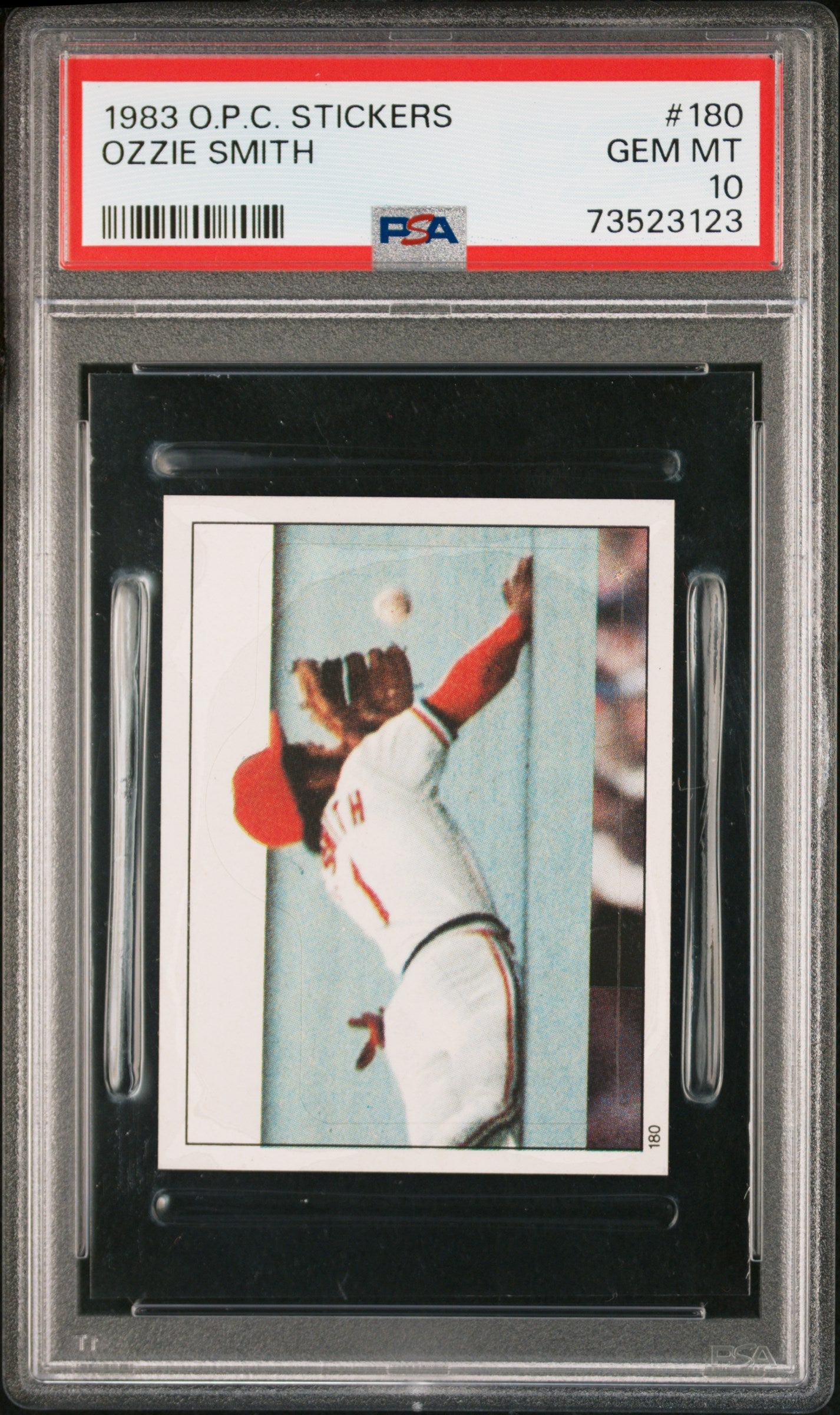 Hello, thanks for your interest in this fixed price listing. You are purchasing a 1983 O-Pee-Chee Stickers Baseball Ozzie Smith #180 PSA 10 73523123. This fixed price listing is for the exact card listed in the title, and shown in the pictures. We guarantee that you will be satisfied with your purchase, or you are welcome to return the card (at my cost) with our 30 day return policy. This listing is brought to you by Sports Cards Grading. Sports Cards Grading is a Top Rated Plus eBay seller. Top Rated Plus eBay sellers are required to provide 30 day free returns, shipping within 1 day, and shipping with tracking. Shipping with tracking in a bubble mailer is our standard method of shipment. Please contact me through eBay if you have any questions on this listing. Thanks for your consideration. Listed With Mascot.