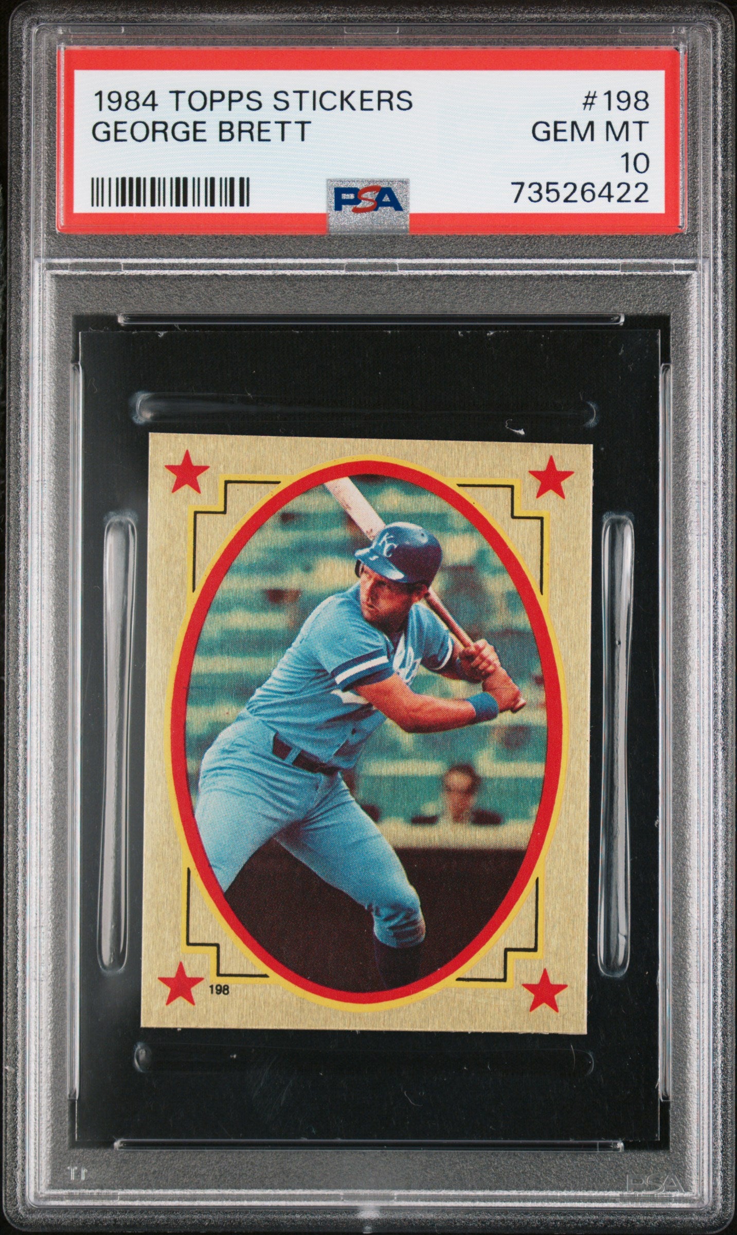 Hello, thanks for your interest in this fixed price listing. You are purchasing a 1984 Topps Stickers Baseball George Brett #198 PSA 10 73526422. This fixed price listing is for the exact card listed in the title, and shown in the pictures. We guarantee that you will be satisfied with your purchase, or you are welcome to return the card (at my cost) with our 30 day return policy. This listing is brought to you by Sports Cards Grading. Sports Cards Grading is a Top Rated Plus eBay seller. Top Rated Plus eBay sellers are required to provide 30 day free returns, shipping within 1 day, and shipping with tracking. Shipping with tracking in a bubble mailer is our standard method of shipment. Please contact me through eBay if you have any questions on this listing. Thanks for your consideration. Listed With Mascot.
