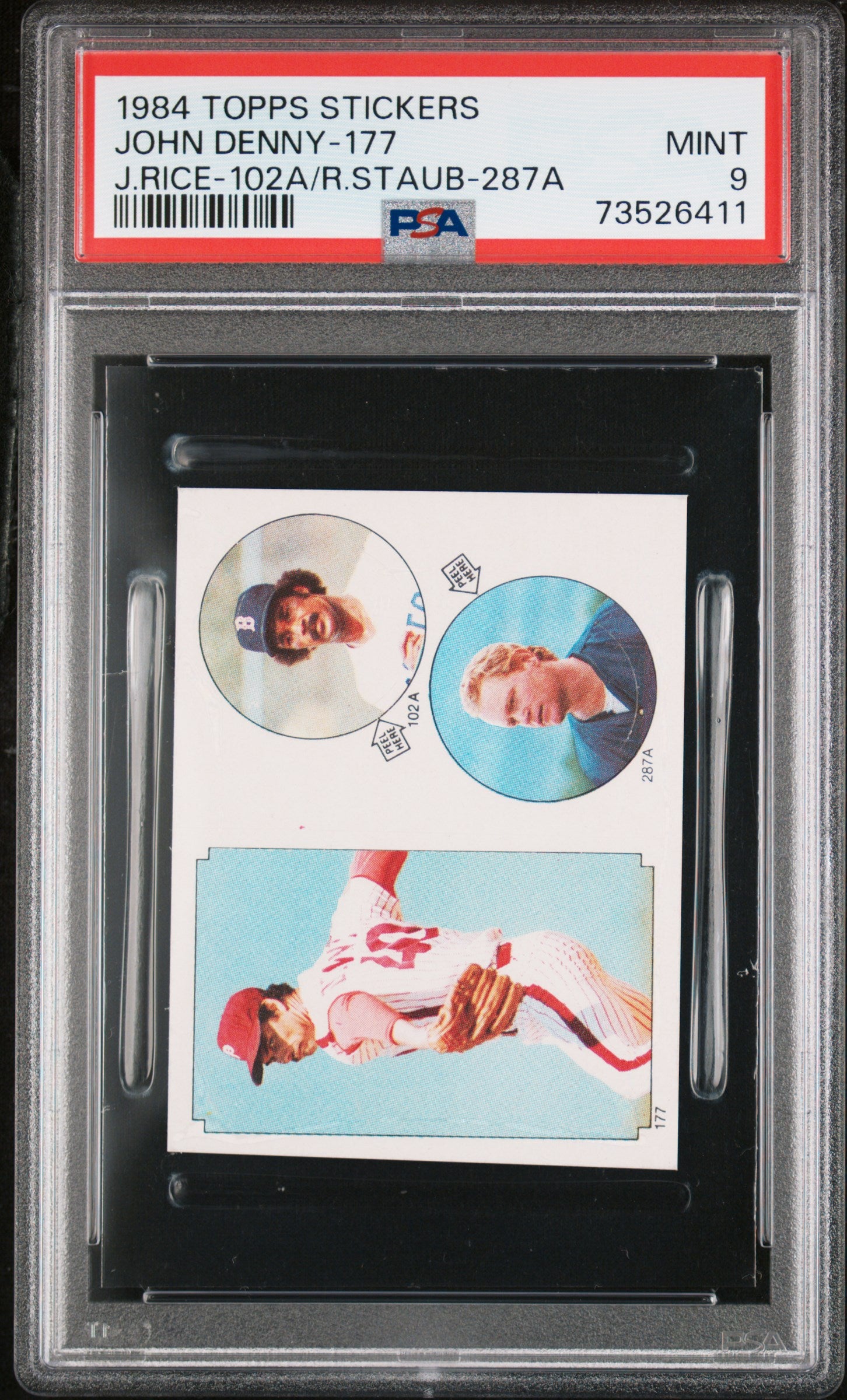 Hello, thanks for your interest in this fixed price listing. You are purchasing a 1984 Topps Stickers Baseball John Denny-177 J.Rice-102a/R.Staub-287a PSA 9 73526411. This fixed price listing is for the exact card listed in the title, and shown in the pictures. We guarantee that you will be satisfied with your purchase, or you are welcome to return the card (at my cost) with our 30 day return policy. This listing is brought to you by Sports Cards Grading. Sports Cards Grading is a Top Rated Plus eBay seller. Top Rated Plus eBay sellers are required to provide 30 day free returns, shipping within 1 day, and shipping with tracking. Shipping with tracking in a bubble mailer is our standard method of shipment. Please contact me through eBay if you have any questions on this listing. Thanks for your consideration. Listed With Mascot.