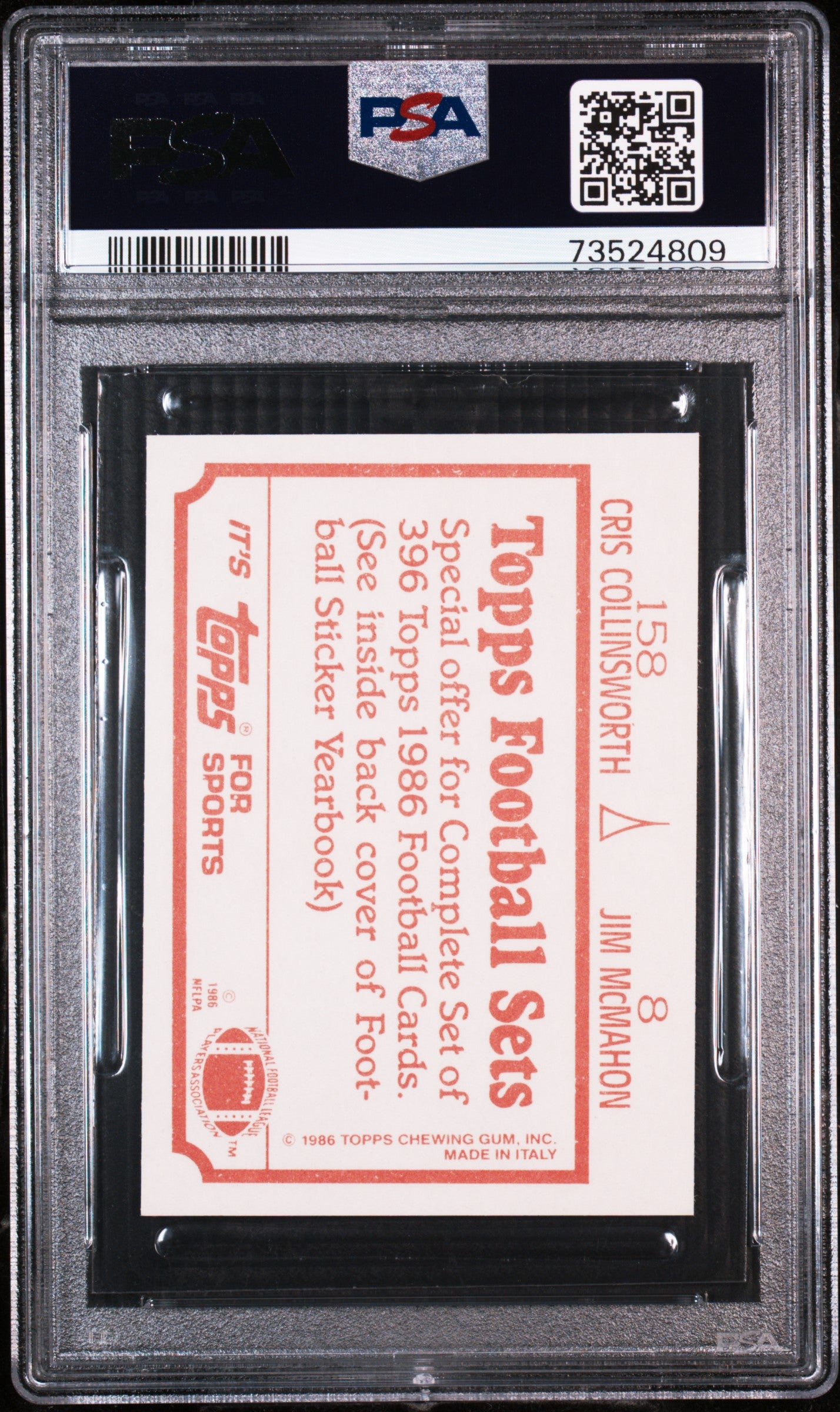 Hello, thanks for your interest in this fixed price listing. You are purchasing a 1986 Topps Stickers Football Jim Mcmahon-8 {cardNumber} 158 PSA 9 73524809. This fixed price listing is for the exact card listed in the title, and shown in the pictures. We guarantee that you will be satisfied with your purchase, or you are welcome to return the card (at my cost) with our 30 day return policy. This listing is brought to you by Sports Cards Grading. Sports Cards Grading is a Top Rated Plus eBay seller. Top Rated Plus eBay sellers are required to provide 30 day free returns, shipping within 1 day, and shipping with tracking. Shipping with tracking in a bubble mailer is our standard method of shipment. Please contact me through eBay if you have any questions on this listing. Thanks for your consideration. Listed With Mascot.