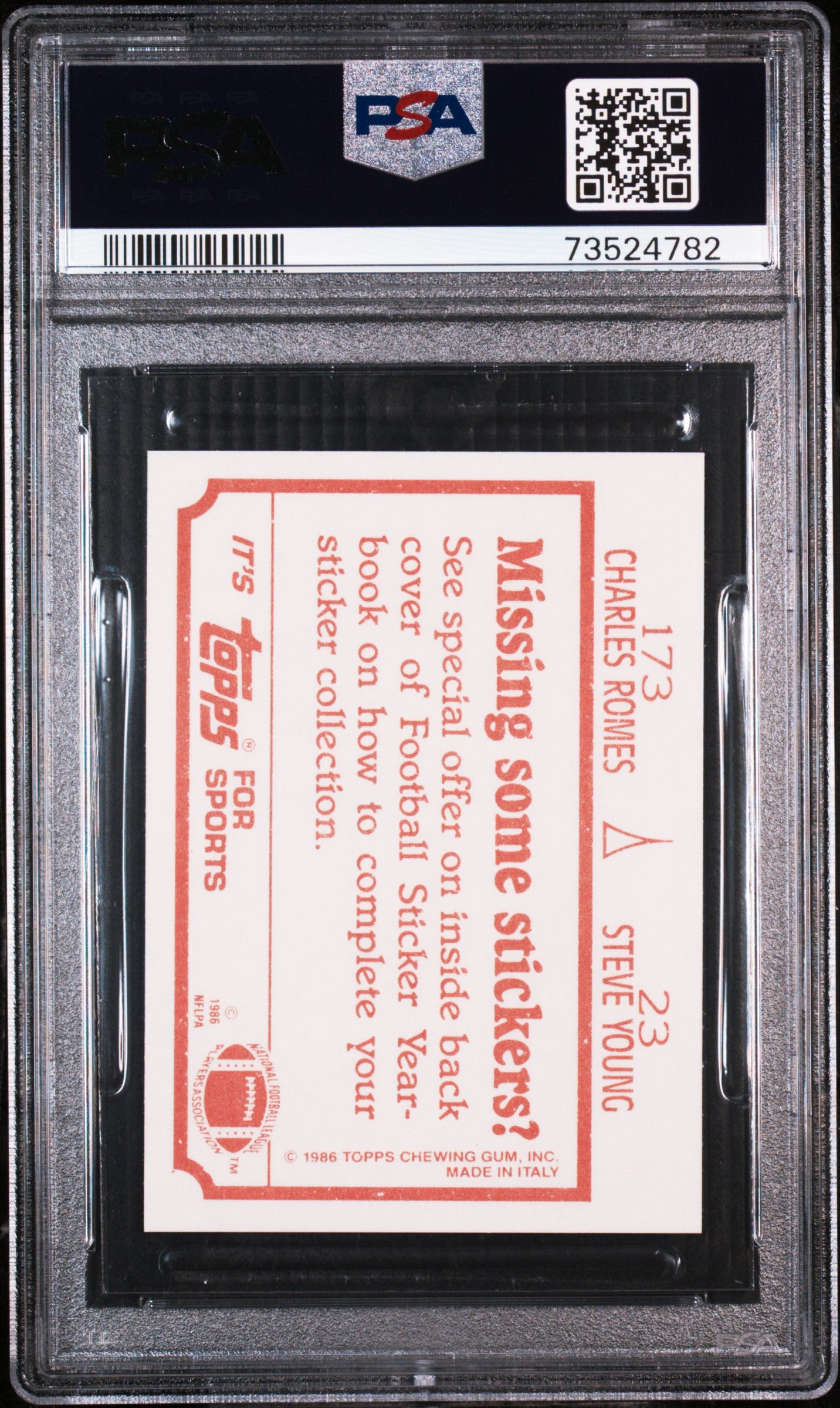 Hello, thanks for your interest in this fixed price listing. You are purchasing a 1986 Topps Stickers Football Steve Young-23 173 PSA 9 73524782. This fixed price listing is for the exact card listed in the title, and shown in the pictures. We guarantee that you will be satisfied with your purchase, or you are welcome to return the card (at my cost) with our 30 day return policy. This listing is brought to you by Sports Cards Grading. Sports Cards Grading is a Top Rated Plus eBay seller. Top Rated Plus eBay sellers are required to provide 30 day free returns, shipping within 1 day, and shipping with tracking. Shipping with tracking in a bubble mailer is our standard method of shipment. Please contact me through eBay if you have any questions on this listing. Thanks for your consideration. Listed With Mascot.