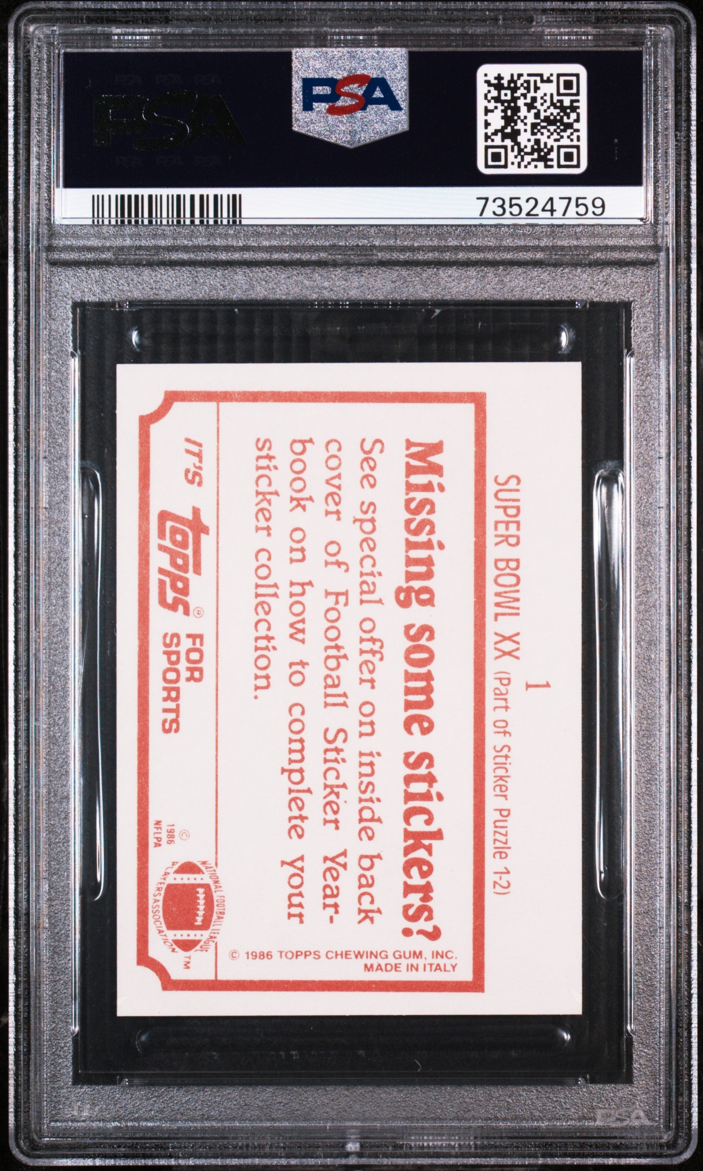Hello, thanks for your interest in this fixed price listing. You are purchasing a 1986 Topps Stickers Football Super Bowl Xx #1 PSA 8 73524759. This fixed price listing is for the exact card listed in the title, and shown in the pictures. We guarantee that you will be satisfied with your purchase, or you are welcome to return the card (at my cost) with our 30 day return policy. This listing is brought to you by Sports Cards Grading. Sports Cards Grading is a Top Rated Plus eBay seller. Top Rated Plus eBay sellers are required to provide 30 day free returns, shipping within 1 day, and shipping with tracking. Shipping with tracking in a bubble mailer is our standard method of shipment. Please contact me through eBay if you have any questions on this listing. Thanks for your consideration. Listed With Mascot.