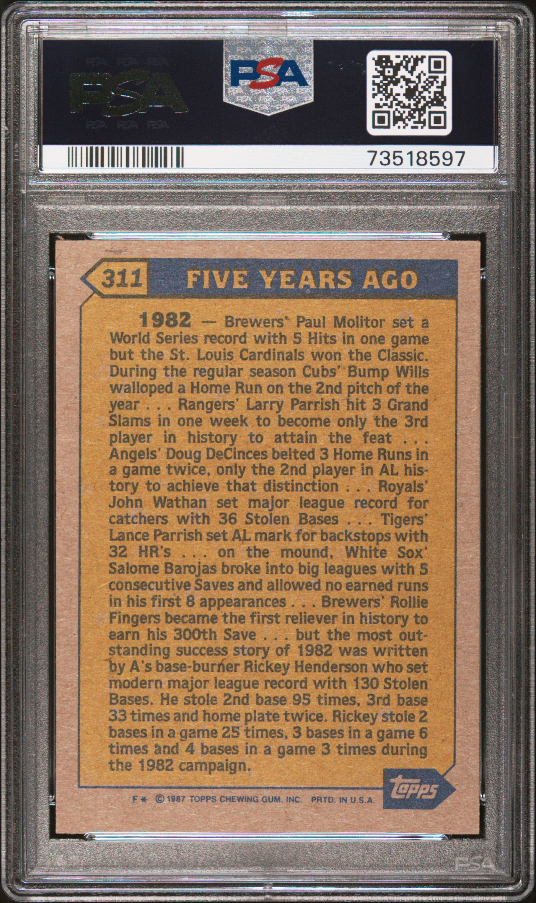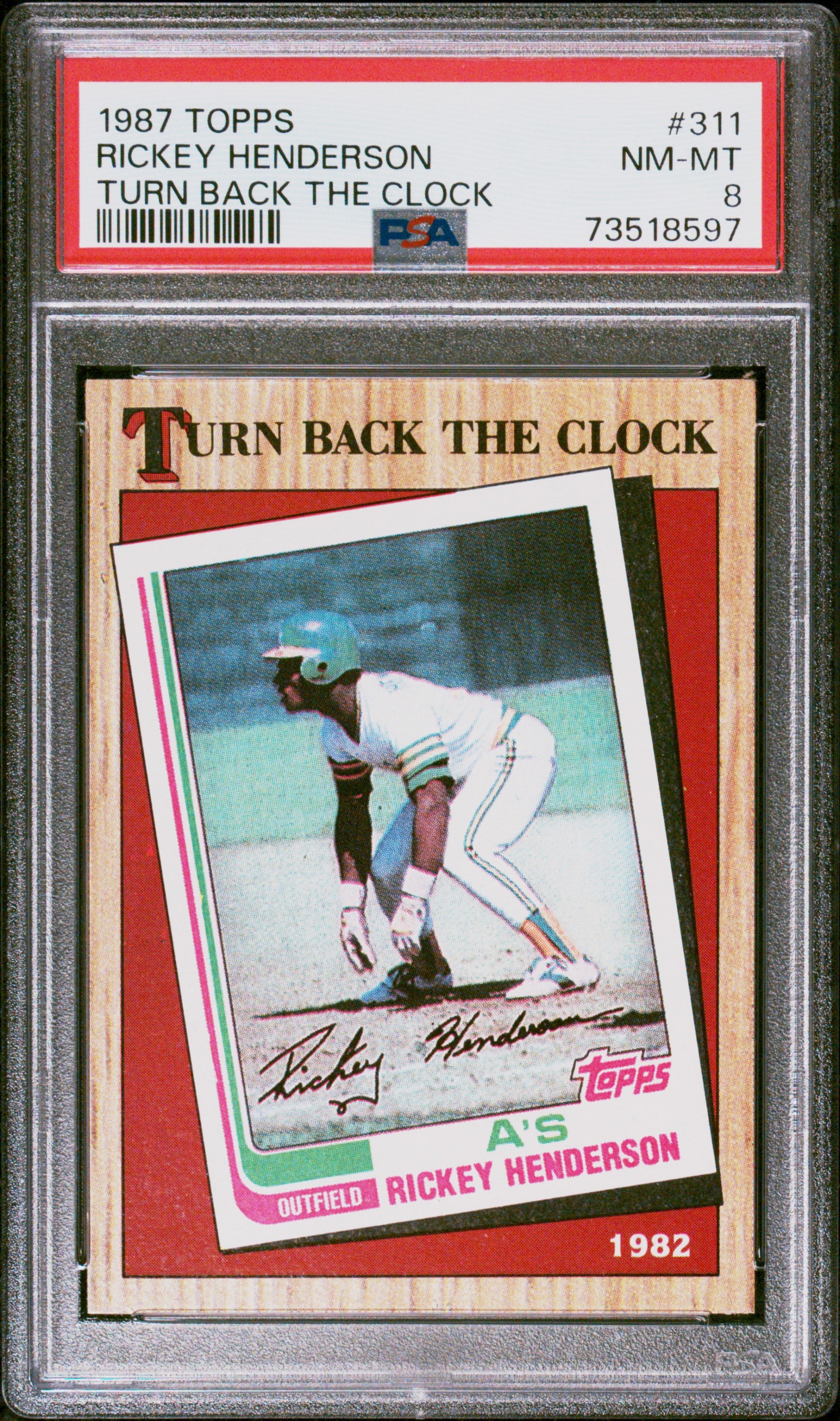 Hello, thanks for your interest in this fixed price listing. You are purchasing a 1987 Topps Baseball Rickey Henderson #311 Turn Back The Clock PSA 8 73518597. This fixed price listing is for the exact card listed in the title, and shown in the pictures. We guarantee that you will be satisfied with your purchase, or you are welcome to return the card (at my cost) with our 30 day return policy. This listing is brought to you by Sports Cards Grading. Sports Cards Grading is a Top Rated Plus eBay seller. Top Rated Plus eBay sellers are required to provide 30 day free returns, shipping within 1 day, and shipping with tracking. Shipping with tracking in a bubble mailer is our standard method of shipment. Please contact me through eBay if you have any questions on this listing. Thanks for your consideration. Listed With Mascot.