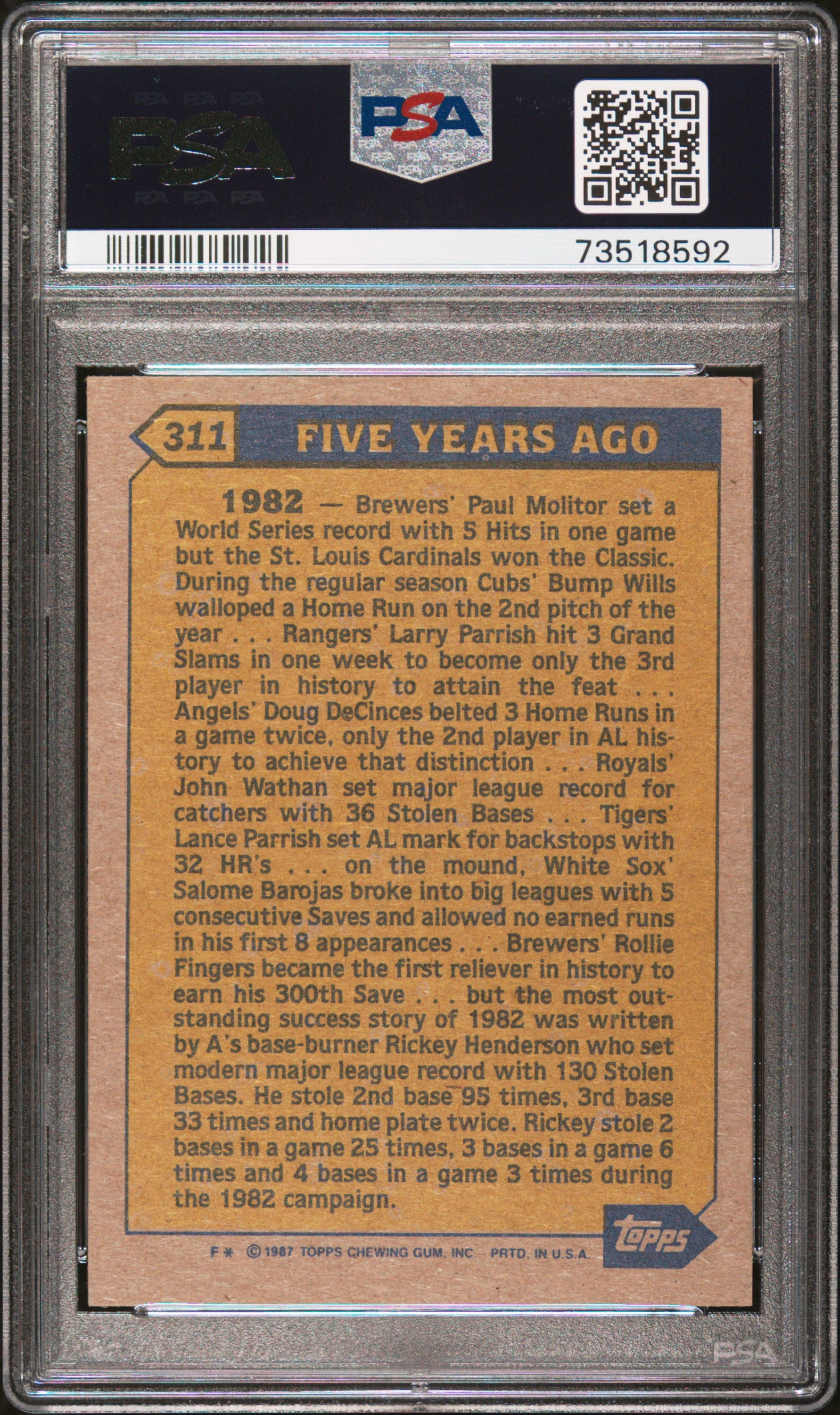 Hello, thanks for your interest in this fixed price listing. You are purchasing a 1987 Topps Baseball Rickey Henderson #311 Turn Back The Clock PSA 8 73518592. This fixed price listing is for the exact card listed in the title, and shown in the pictures. We guarantee that you will be satisfied with your purchase, or you are welcome to return the card (at my cost) with our 30 day return policy. This listing is brought to you by Sports Cards Grading. Sports Cards Grading is a Top Rated Plus eBay seller. Top Rated Plus eBay sellers are required to provide 30 day free returns, shipping within 1 day, and shipping with tracking. Shipping with tracking in a bubble mailer is our standard method of shipment. Please contact me through eBay if you have any questions on this listing. Thanks for your consideration. Listed With Mascot.