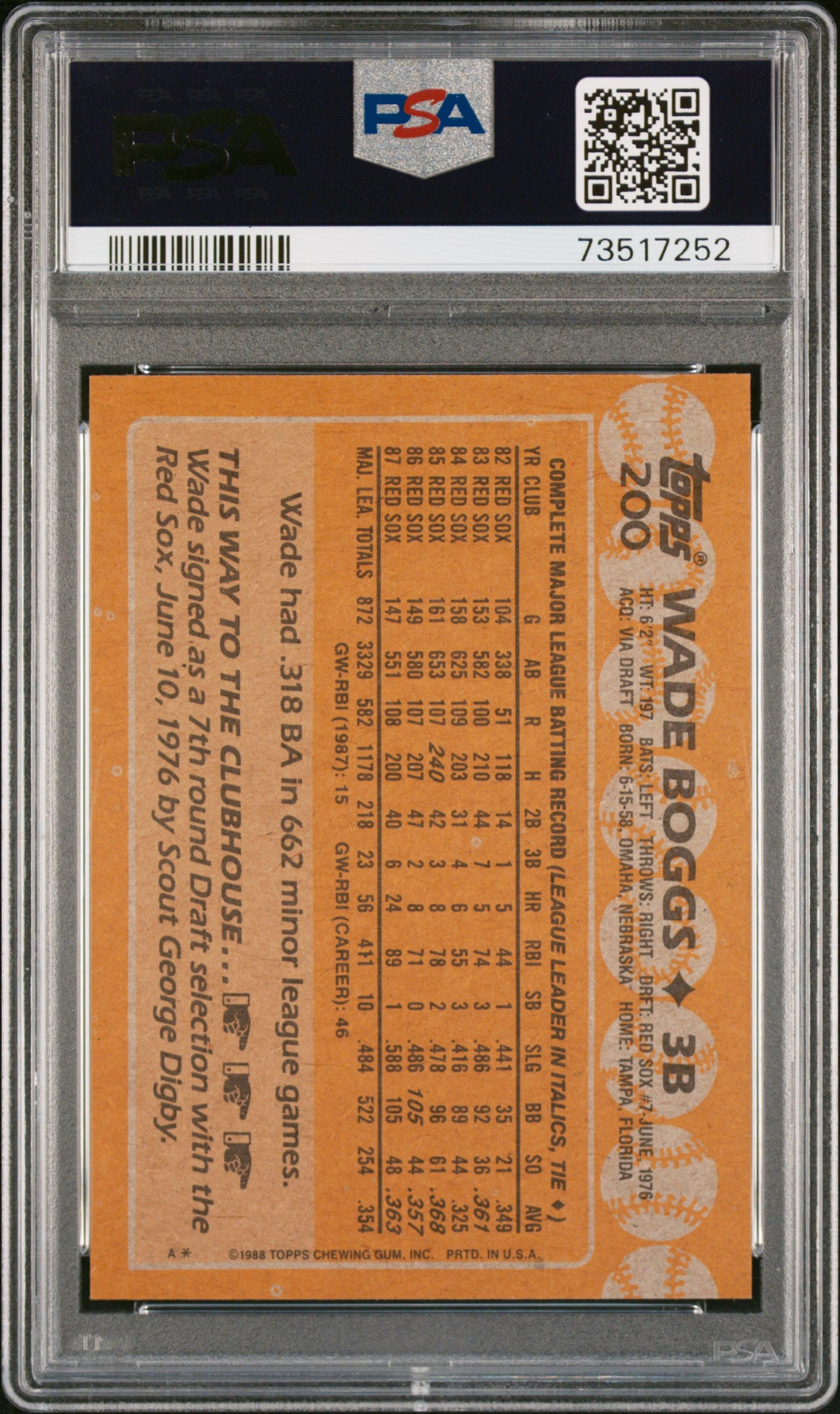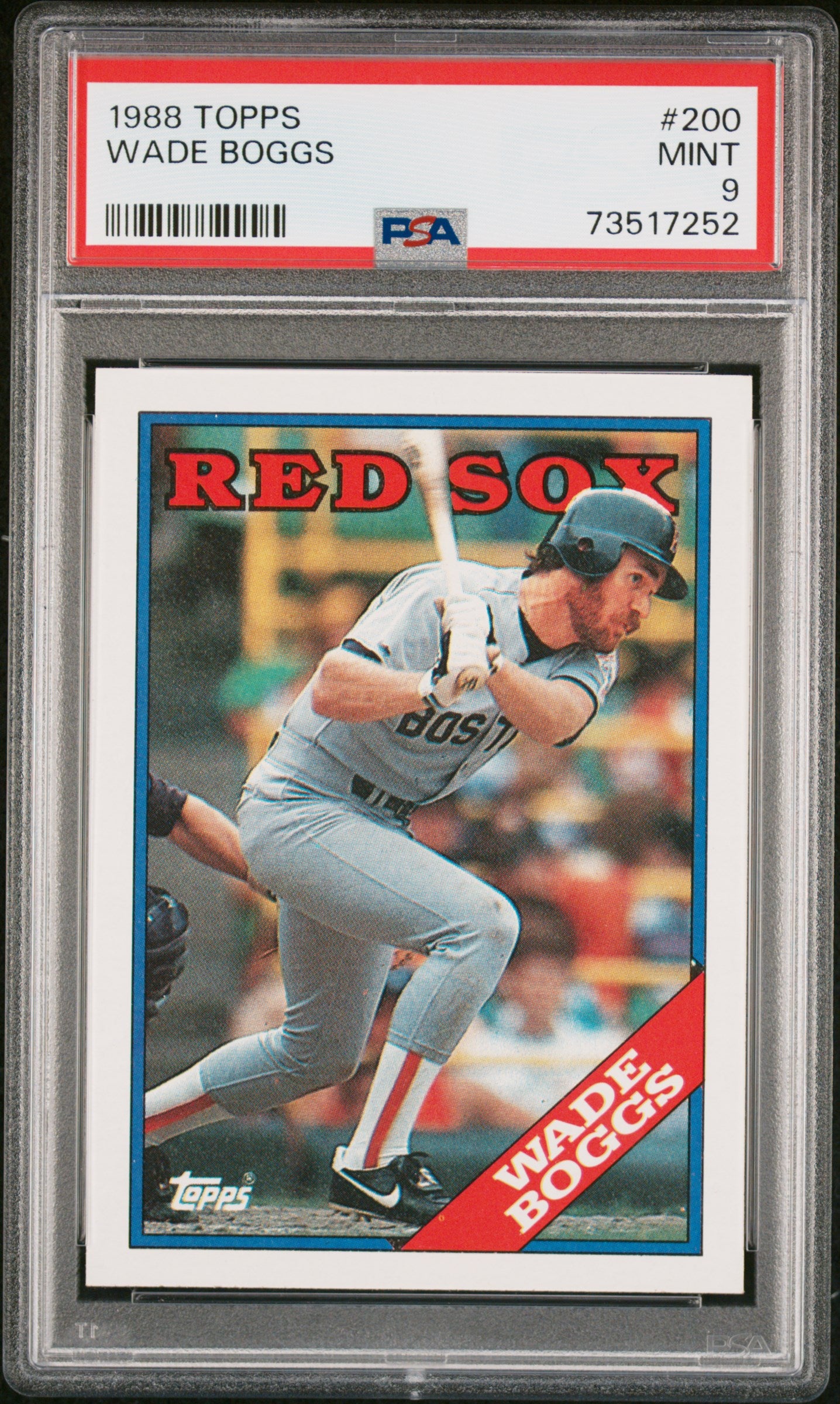 Hello, thanks for your interest in this fixed price listing. You are purchasing a 1988 Topps Baseball Wade Boggs #200 PSA 9 73517252. This fixed price listing is for the exact card listed in the title, and shown in the pictures. We guarantee that you will be satisfied with your purchase, or you are welcome to return the card (at my cost) with our 30 day return policy. This listing is brought to you by Sports Cards Grading. Sports Cards Grading is a Top Rated Plus eBay seller. Top Rated Plus eBay sellers are required to provide 30 day free returns, shipping within 1 day, and shipping with tracking. Shipping with tracking in a bubble mailer is our standard method of shipment. Please contact me through eBay if you have any questions on this listing. Thanks for your consideration. Listed With Mascot.