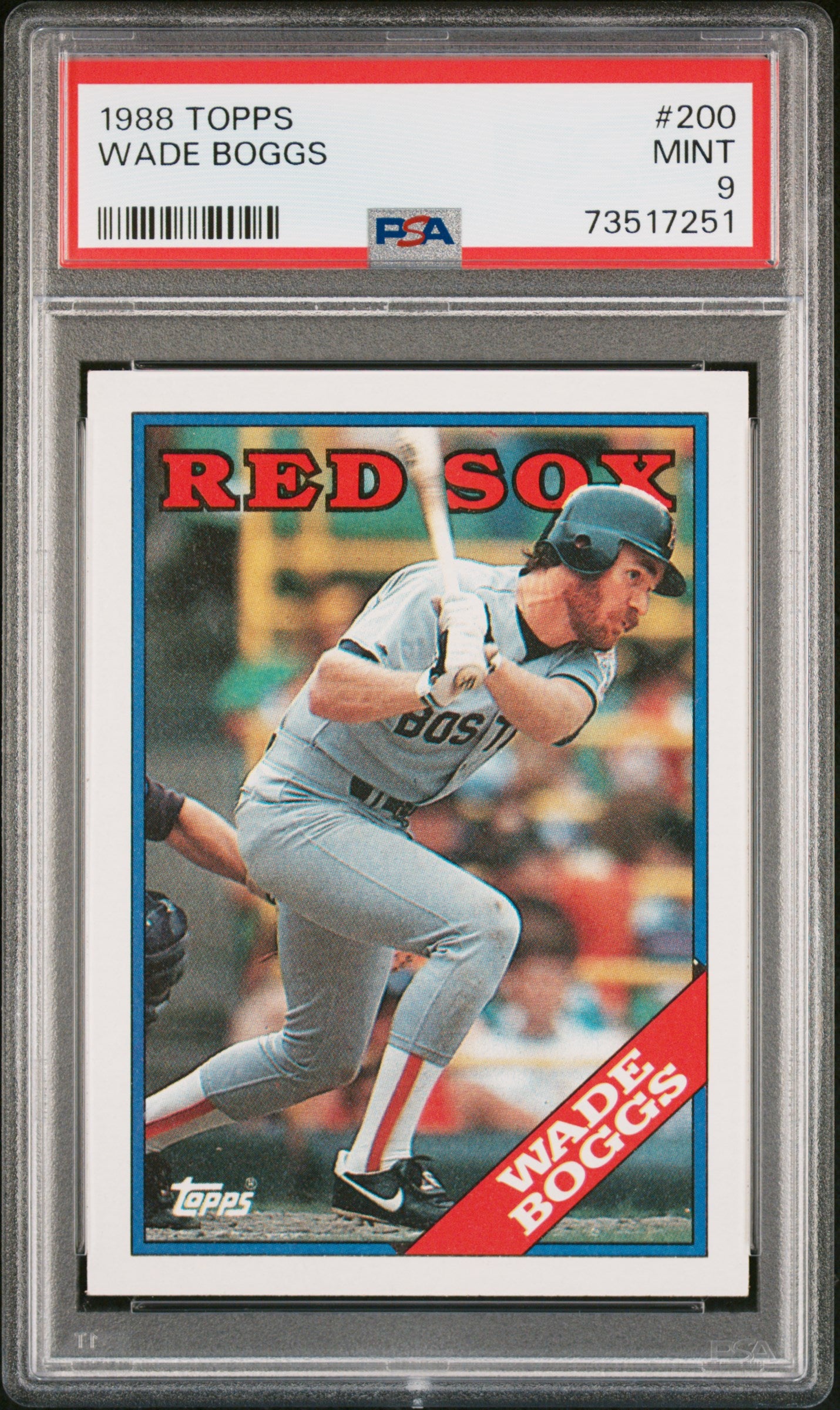 Hello, thanks for your interest in this fixed price listing. You are purchasing a 1988 Topps Baseball Wade Boggs #200 PSA 9 73517251. This fixed price listing is for the exact card listed in the title, and shown in the pictures. We guarantee that you will be satisfied with your purchase, or you are welcome to return the card (at my cost) with our 30 day return policy. This listing is brought to you by Sports Cards Grading. Sports Cards Grading is a Top Rated Plus eBay seller. Top Rated Plus eBay sellers are required to provide 30 day free returns, shipping within 1 day, and shipping with tracking. Shipping with tracking in a bubble mailer is our standard method of shipment. Please contact me through eBay if you have any questions on this listing. Thanks for your consideration. Listed With Mascot.