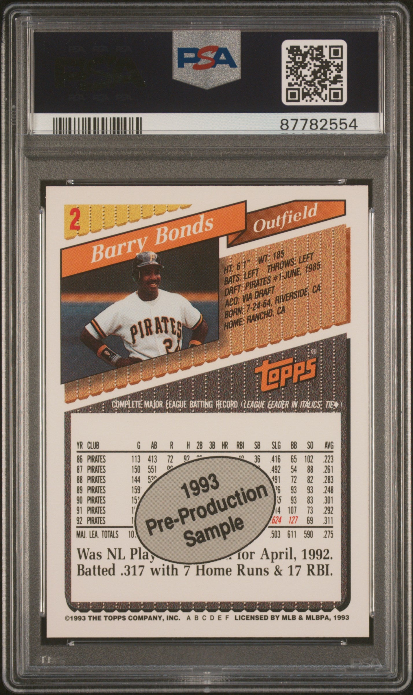 1993 Topps Pre-Production Baseball Barry Bonds #2 PSA 10 87782554 POP 5