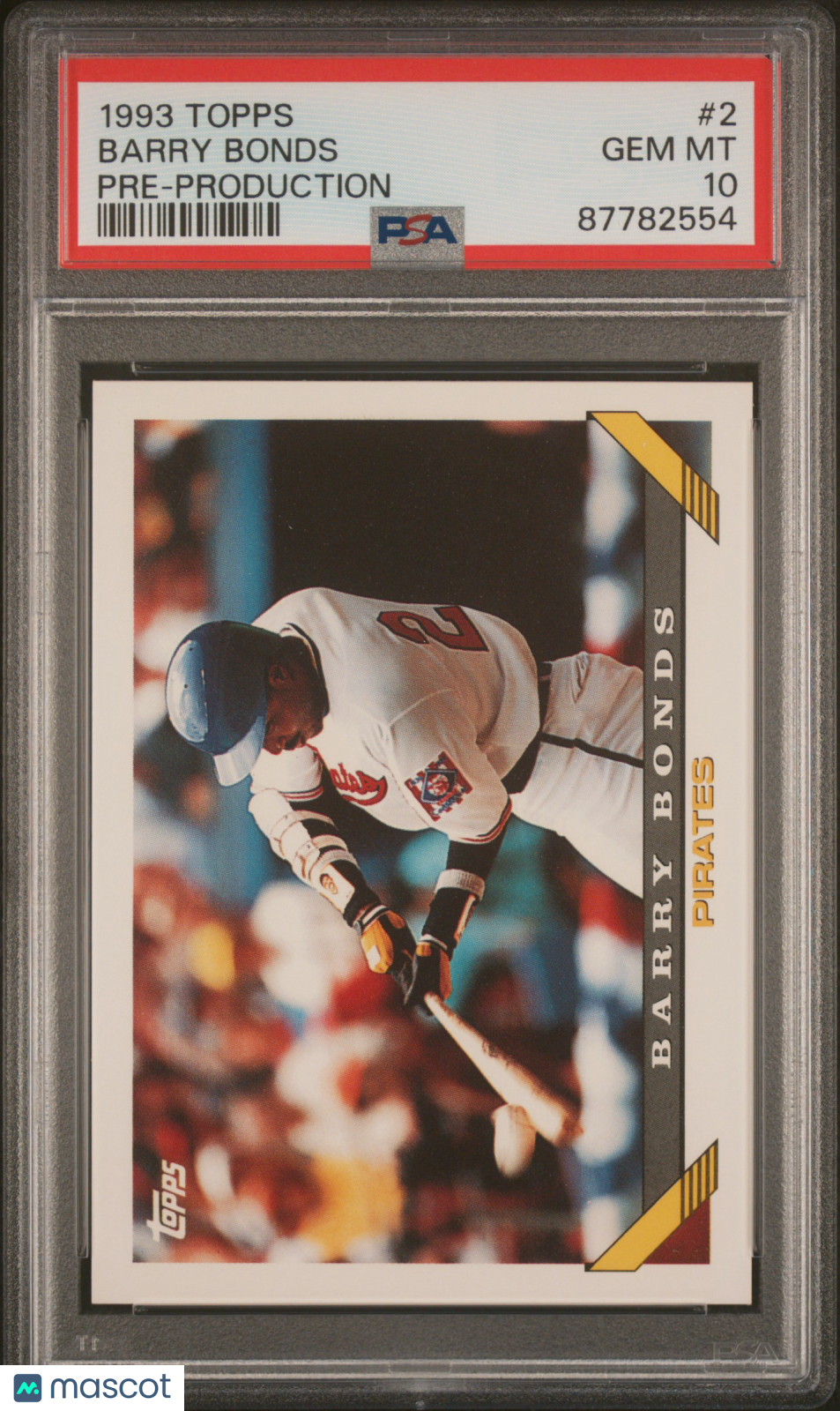 Hello, thanks for your interest in this fixed price listing. You are purchasing a 1993 Topps Pre-Production Baseball Barry Bonds #2 PSA 10 87782554. This fixed price listing is for the exact card listed in the title, and shown in the pictures. We guarantee that you will be satisfied with your purchase, or you are welcome to return the card (at my cost) with our 30 day return policy. This listing is brought to you by Sports Cards Grading. Sports Cards Grading is a Top Rated Plus eBay seller. Top Rated Plus eBay sellers are required to provide 30 day free returns, shipping within 1 day, and shipping with tracking. Shipping with tracking in a bubble mailer is our standard method of shipment. Please contact me through eBay if you have any questions on this listing. Thanks for your consideration. Listed With Mascot.