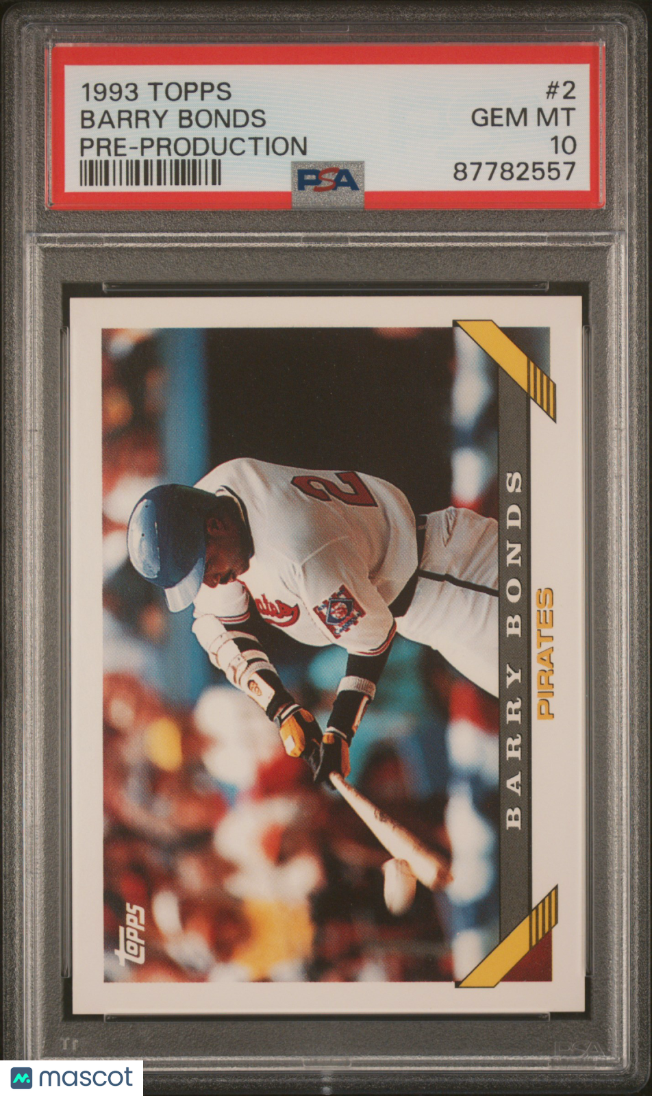 Hello, thanks for your interest in this fixed price listing. You are purchasing a 1993 Topps Pre-Production Baseball Barry Bonds #2 PSA 10 87782557. This fixed price listing is for the exact card listed in the title, and shown in the pictures. We guarantee that you will be satisfied with your purchase, or you are welcome to return the card (at my cost) with our 30 day return policy. This listing is brought to you by Sports Cards Grading. Sports Cards Grading is a Top Rated Plus eBay seller. Top Rated Plus eBay sellers are required to provide 30 day free returns, shipping within 1 day, and shipping with tracking. Shipping with tracking in a bubble mailer is our standard method of shipment. Please contact me through eBay if you have any questions on this listing. Thanks for your consideration. Listed With Mascot.