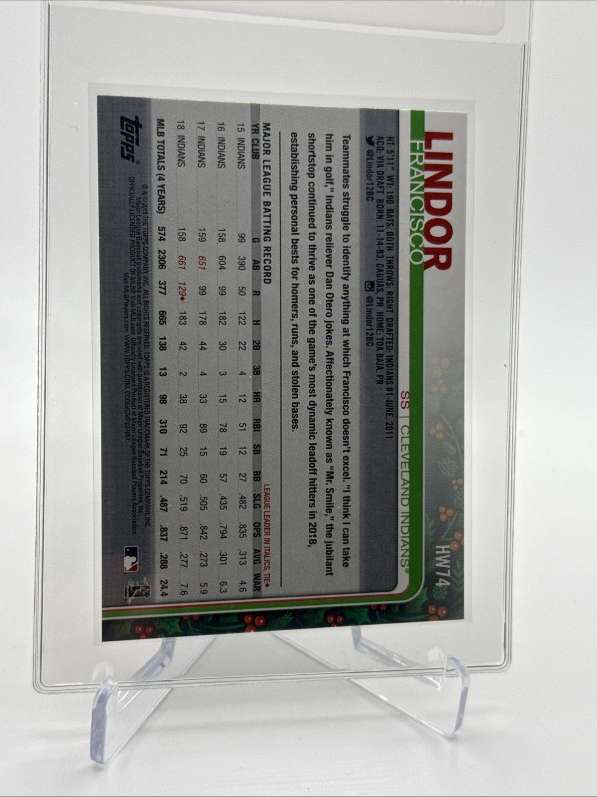 2019 Topps HOLIDAY Francisco Lindor Baseball Card #HW74 Mint FREE SHIPPING