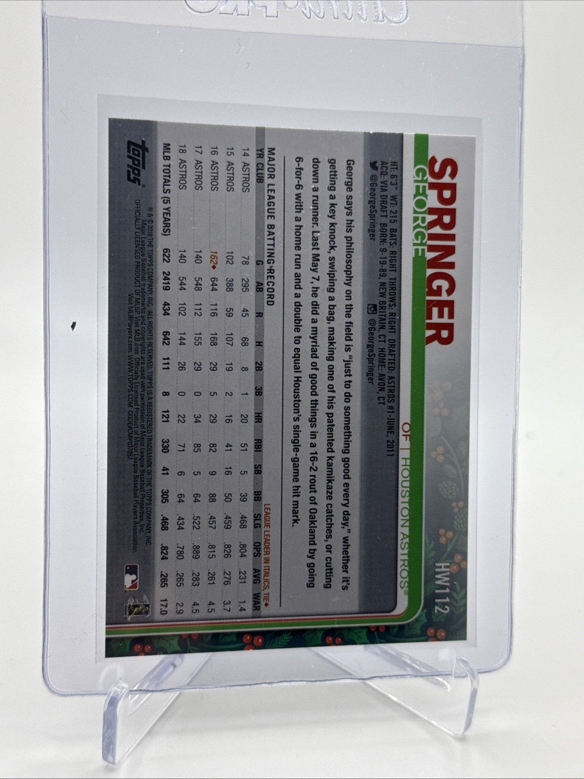 2019 Topps HOLIDAY George Springer Baseball Card #HW112 Mint FREE SHIPPING