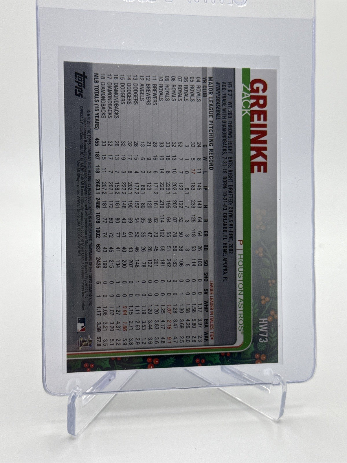 2019 Topps HOLIDAY Zack Greinke Baseball Card #HW73 Mint FREE SHIPPING