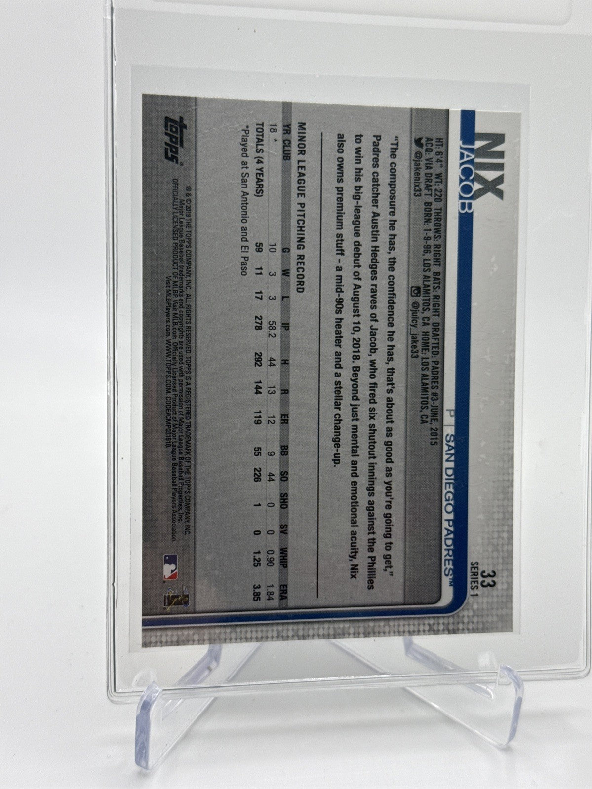 2019 Topps Jacob Nix Rookie Baseball Card #33 Mint FREE SHIPPING