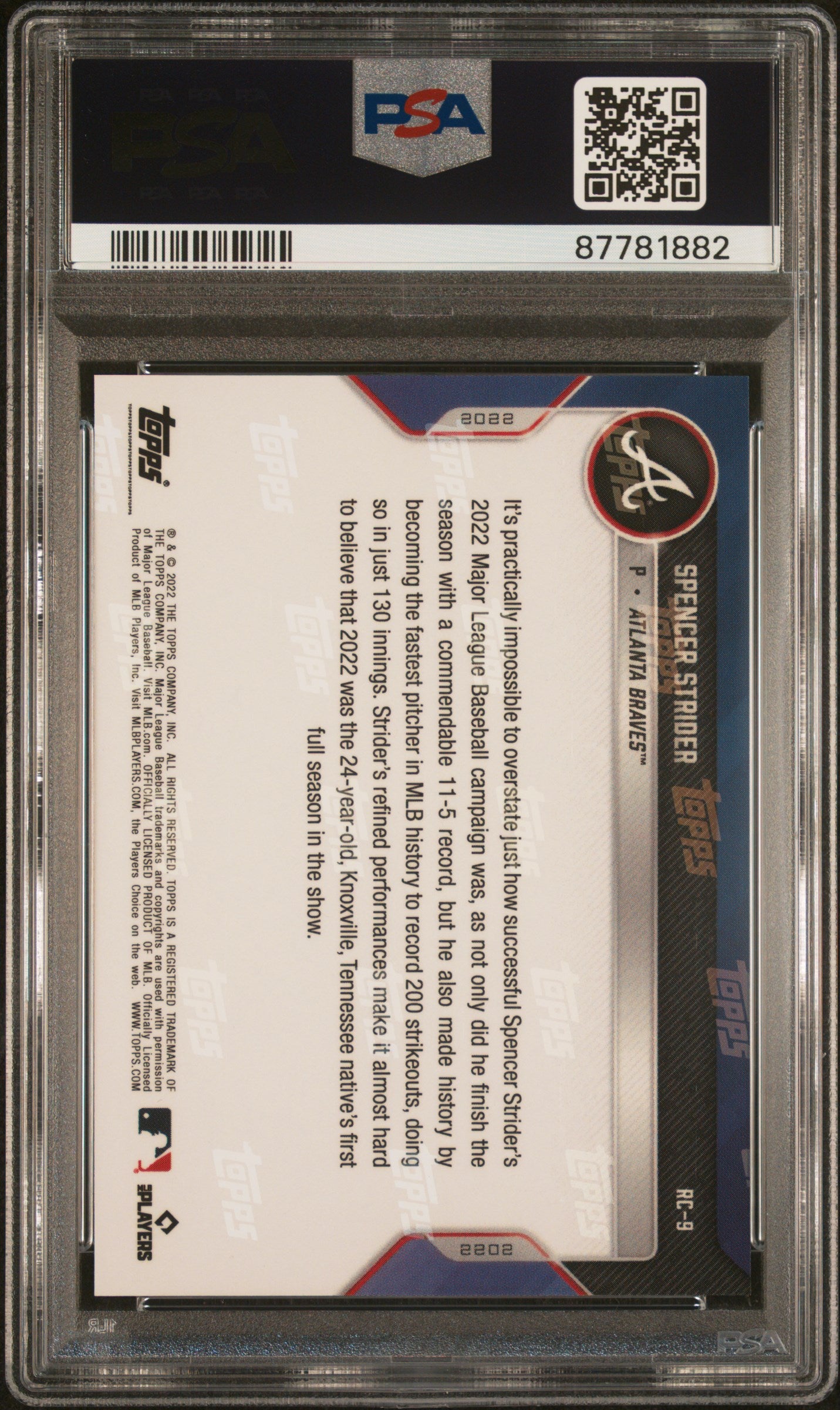 Hello, thanks for your interest in this fixed price listing. You are purchasing a 2022 Topps Now Offseason Rookie Cup MLB All-Star Rookie Team Baseball Spencer Strider #RC-9 PSA 10 87781882. This fixed price listing is for the exact card listed in the title, and shown in the pictures. We guarantee that you will be satisfied with your purchase, or you are welcome to return the card (at my cost) with our 30 day return policy. This listing is brought to you by Sports Cards Grading. Sports Cards Grading is a Top Rated Plus eBay seller. Top Rated Plus eBay sellers are required to provide 30 day free returns, shipping within 1 day, and shipping with tracking. Shipping with tracking in a bubble mailer is our standard method of shipment. Please contact me through eBay if you have any questions on this listing. Thanks for your consideration. Listed With Mascot.