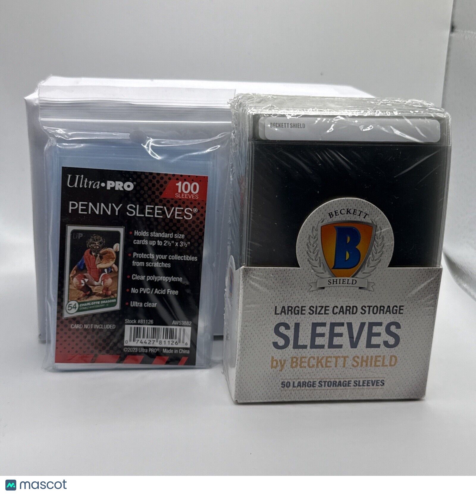 Hello, thanks for your interest in this fixed price listing. This fixed price listing is for the exact Beckett Shield supplies listed in the title, and you will receive a sealed pack of 50 brand new graded card submission sleeves and a pack of 100 Ultra Pro soft sleeves, standard size. We guarantee that you will be satisfied with your purchase, or you are welcome to return the supplies (at my cost) with our 30 day return policy. This listing is brought to you by Sports Cards Grading. Sports Cards Grading is a Top Rated Plus eBay seller. Top Rated Plus eBay sellers are required to provide 30 day free returns, shipping within 1 day, and shipping with tracking. Shipping with tracking in a bubble mailer is our standard method of shipment. Please contact me through eBay if you have any questions on this listing. Thanks for your consideration. Listed With Mascot.